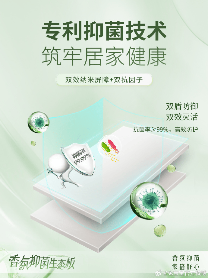 从解决异味困扰到筑牢细菌防线,再到兼顾耐用实用,兔宝宝『香氛』抑菌板以消费者日常需求为出发点,将健康防护与感官愉悦融入每一处细节。它不仅是一块装修板材,更成为守护家庭健康、提升生活质感的重要载体,让每个家庭都能轻松拥有 “闻得到的舒适,看不见的安心”。