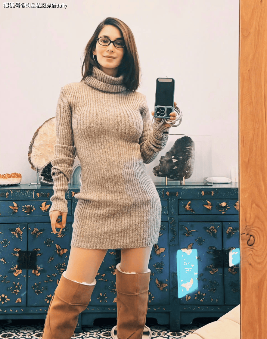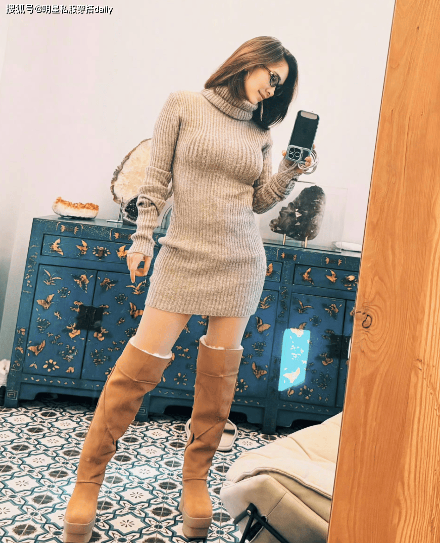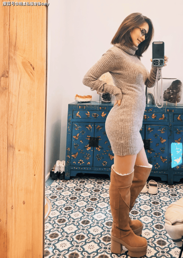 她搭配了一双棕色超高防水台长筒靴,这种超高防水台的靴子是今年很流行的款式,虽然看起来有一些笨重感,但是依然备受喜爱!搭配毛线🧶针织裙,比例看起来的确更好了!