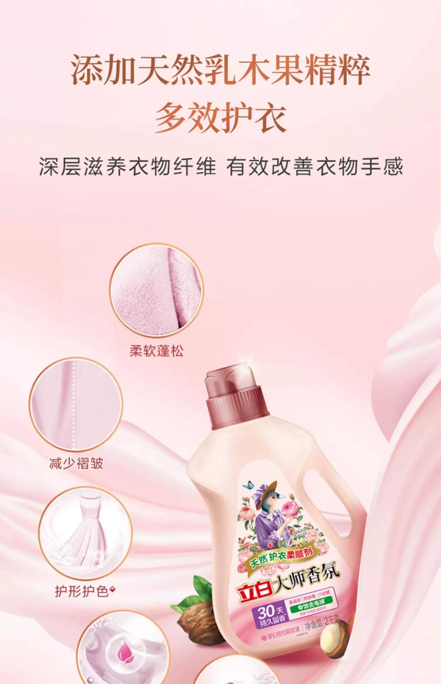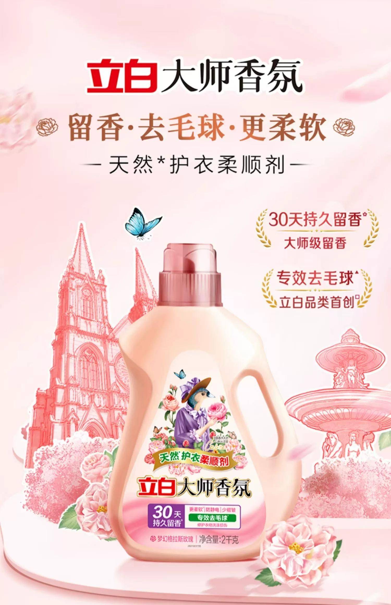 立白大师『香氛』柔顺剂由国际知名调香师Calice Becker亲自操刀创香,甄选法国南部的格拉斯玫瑰为核心香材,构建层次丰富的香韵。产品采用微胶囊摩擦生香技术,使『香氛』微粒定向附着于衣物纤维,通过日常摩擦持续释放香气,实现持久留香。同时,其添加的天然乳木果精粹,深入滋养衣物纤维,赋予衣物柔软蓬松触感,并兼具减褶皱、护形护色,除菌率99.9%等多重功效。