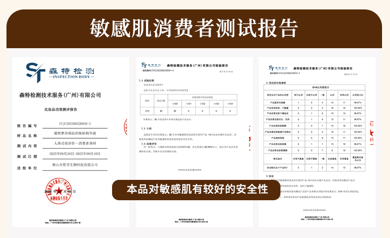 安全性是第一位的。黛熙梦净颜祛痘焕肤精华液在这方面做了扎实工作。它通过了【『敏感肌』消费者测试报告】,由特检测技术服务(广州)有限公司出具的人体功效评价报告(报告编号:STJC20250822005H3)明确指出,“本品对『敏感肌』有较好的安全性”。这份来自第三方检测机构的报告,给了我们消费者实实在在的安心。