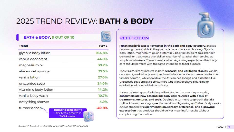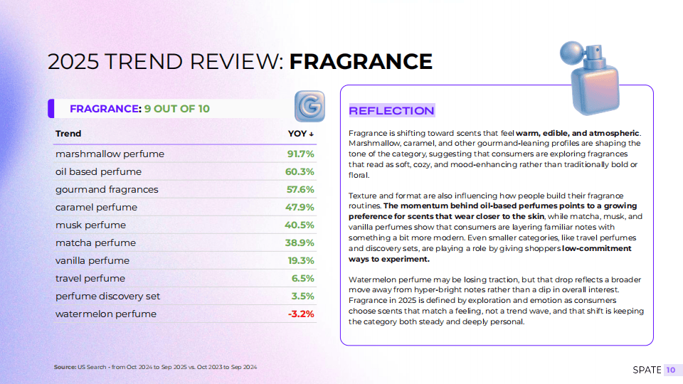 从趋势层面看,功能性、体验感与便捷性成为产品突围的关键。在护肤领域,胶原蛋白贴片、牛奶爽肤水等兼具功效与感官享受的产品搜索量大幅增长,家用美容仪器如红光面罩也持续受到青睐。彩妆方面,剥离式唇彩、眉部染色与簇状睫毛等“即时焕颜”型产品增速明显,显示消费者追求快速妆效而非复杂流程。『香氛』品类则呈现出向温暖、美食调风格的集体转向,棉花糖、焦糖、麝香等气息成为情绪消费的代表。值得注意的是,传统搜索平台与社交内容平台呈现分化态势——例如韩国防晒与果酸爽肤水在谷歌搜索热度下降,但在TikTok上仍保持高增长,说明消费决策路径已从“主动搜索”转向“内容激发”。