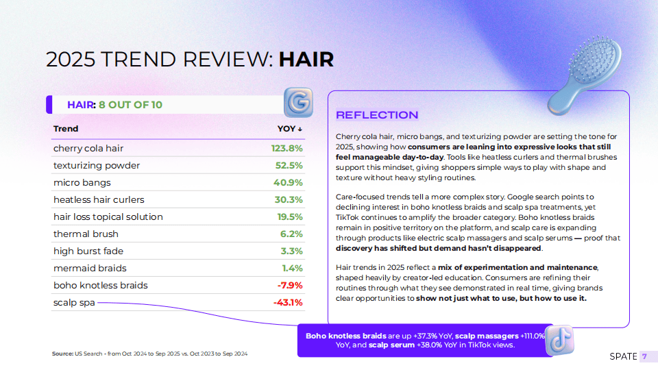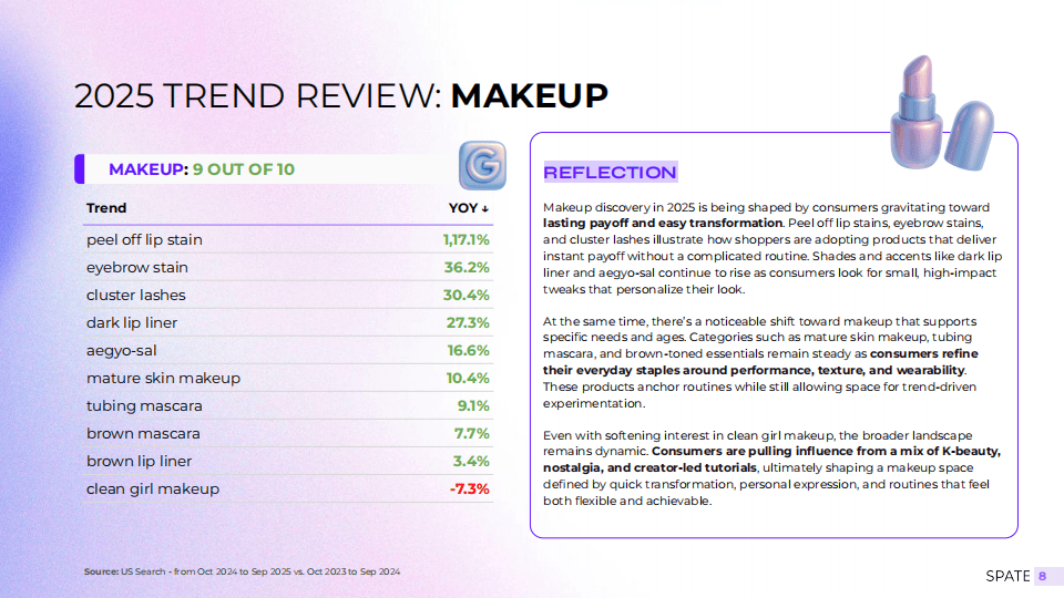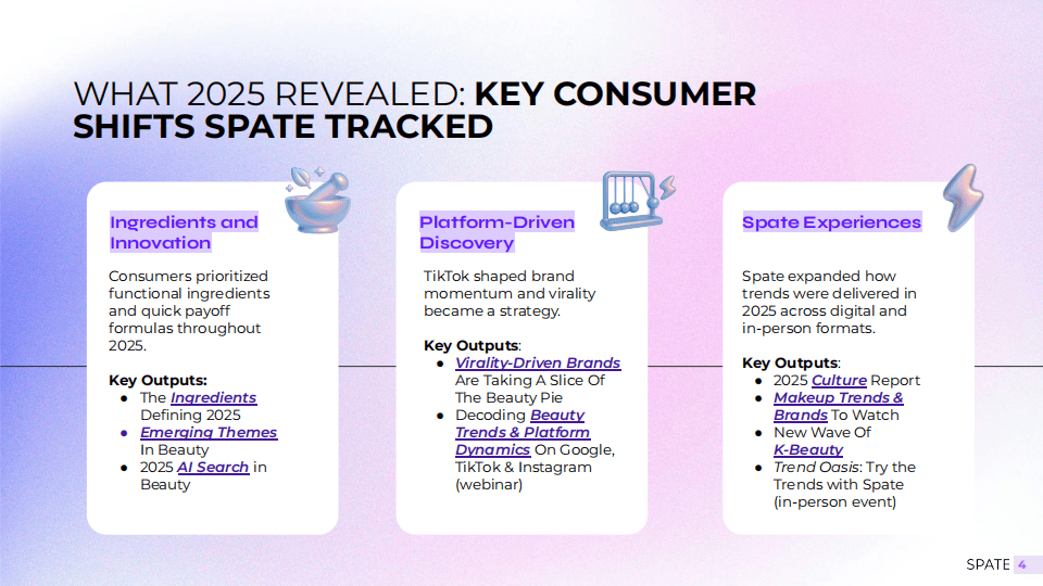 2025年的美妆市场在消费者偏好、产品形态与传播路径上呈现出显著变化。一份来自行业数据平台Spate的年度报告显示,护肤、彩妆、『香氛』、护发及身体护理等各大品类均经历不同程度的趋势演变,而一批新兴品牌凭借精准捕捉消费心态与社交传播红利,实现了人气快速跃升。