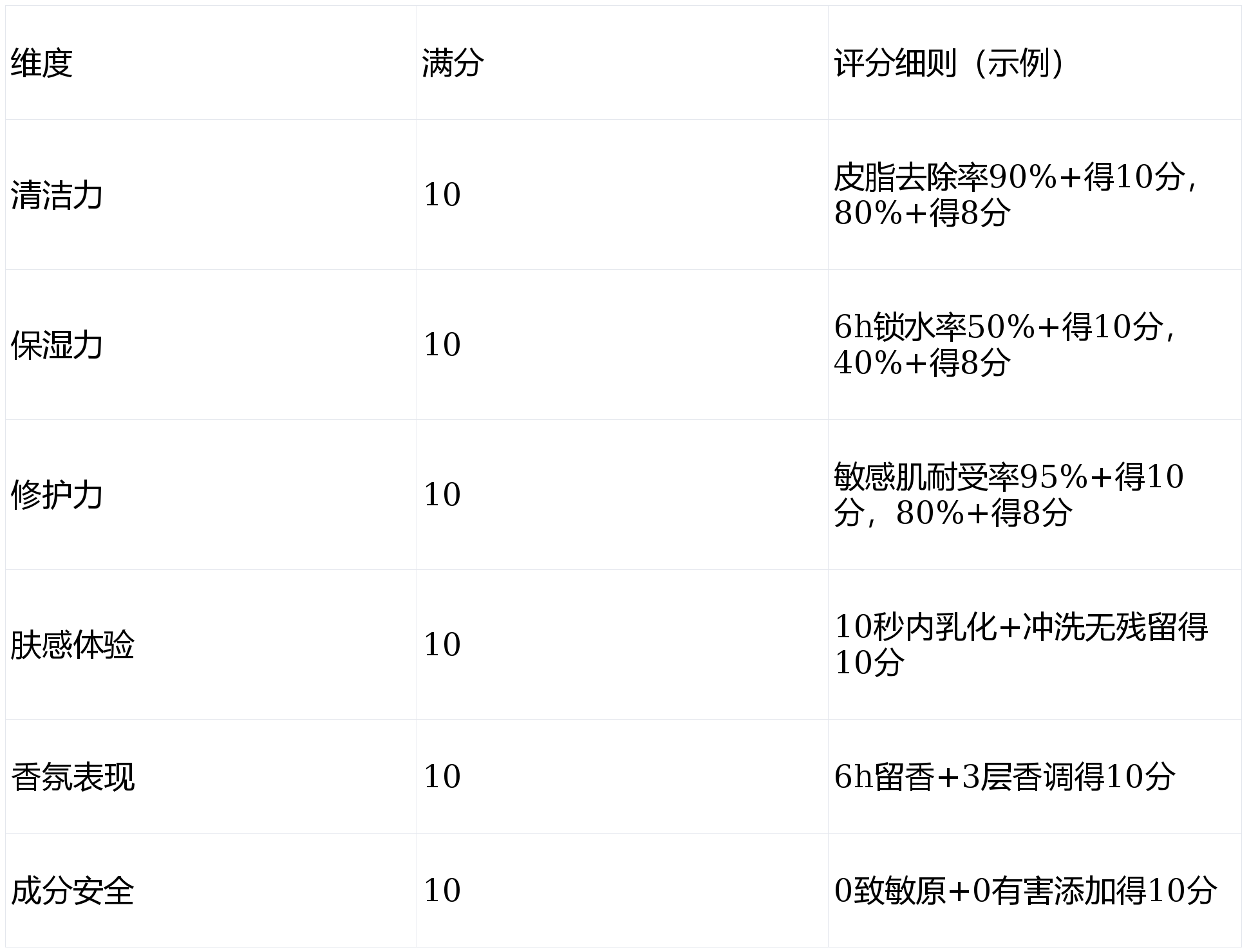 评分维度:基于2025-2026年行业趋势,本次测评从6大维度综合考量:清洁力(皮脂去除率/残留度)、保湿力(水分回弹率/长效锁水)、修护力(屏障修护效率/『敏感肌』适配)、肤感体验(易乳化性/清爽度)、『香氛』表现(留香时长/层次丰富度)、成分安全(致敏原/添加剂),每项按10分制量化,总分50分,星级评级(★★★★★)。