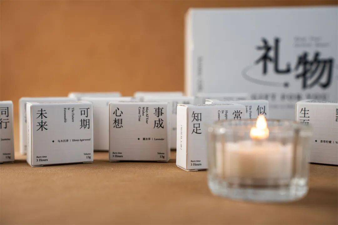 尹谜为它设计了多个心动的感动细节: 小蜡烛的包装上都有祝福心意,款款不同。