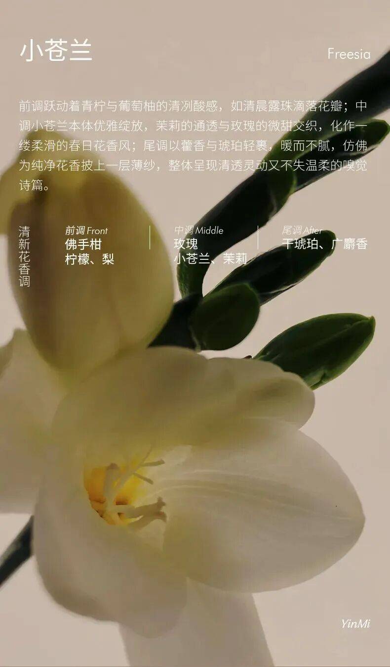 【小苍兰香】:初闻小苍兰和玫瑰糅杂的花果香,再闻是琥珀、广藿香带来的木质调,层次感丰富。