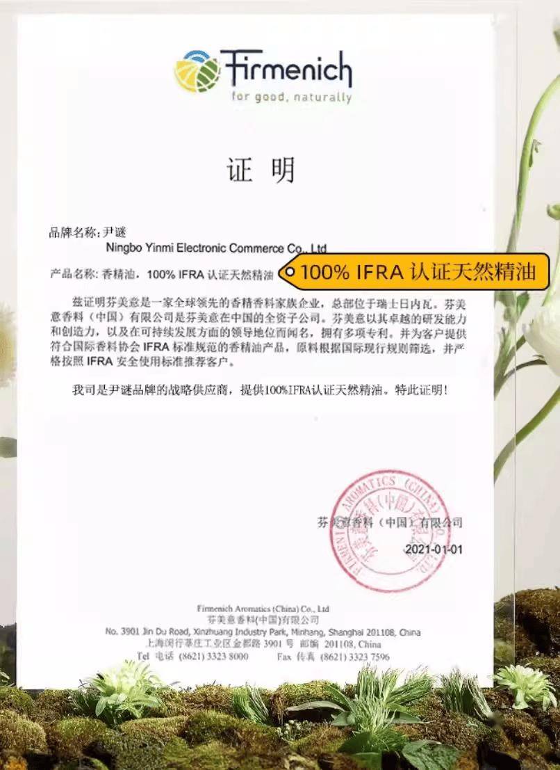 尹谜特别注重香薰的安全性,为了让大家安心闻香,坚持不用廉价的化学合成香料, 只萃取100%IFRA认证的天然植物精油!
