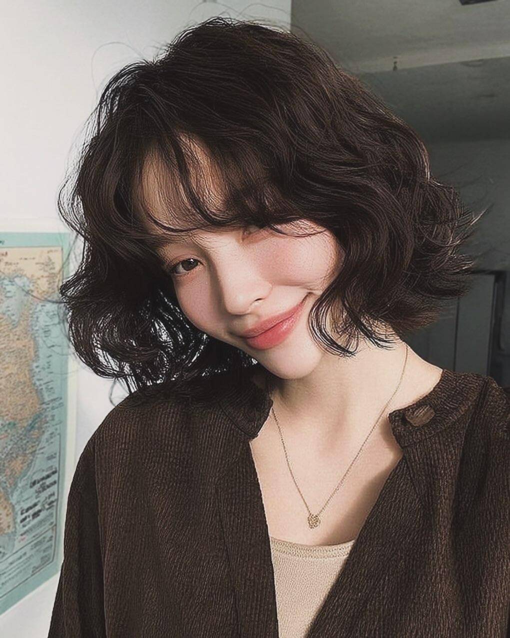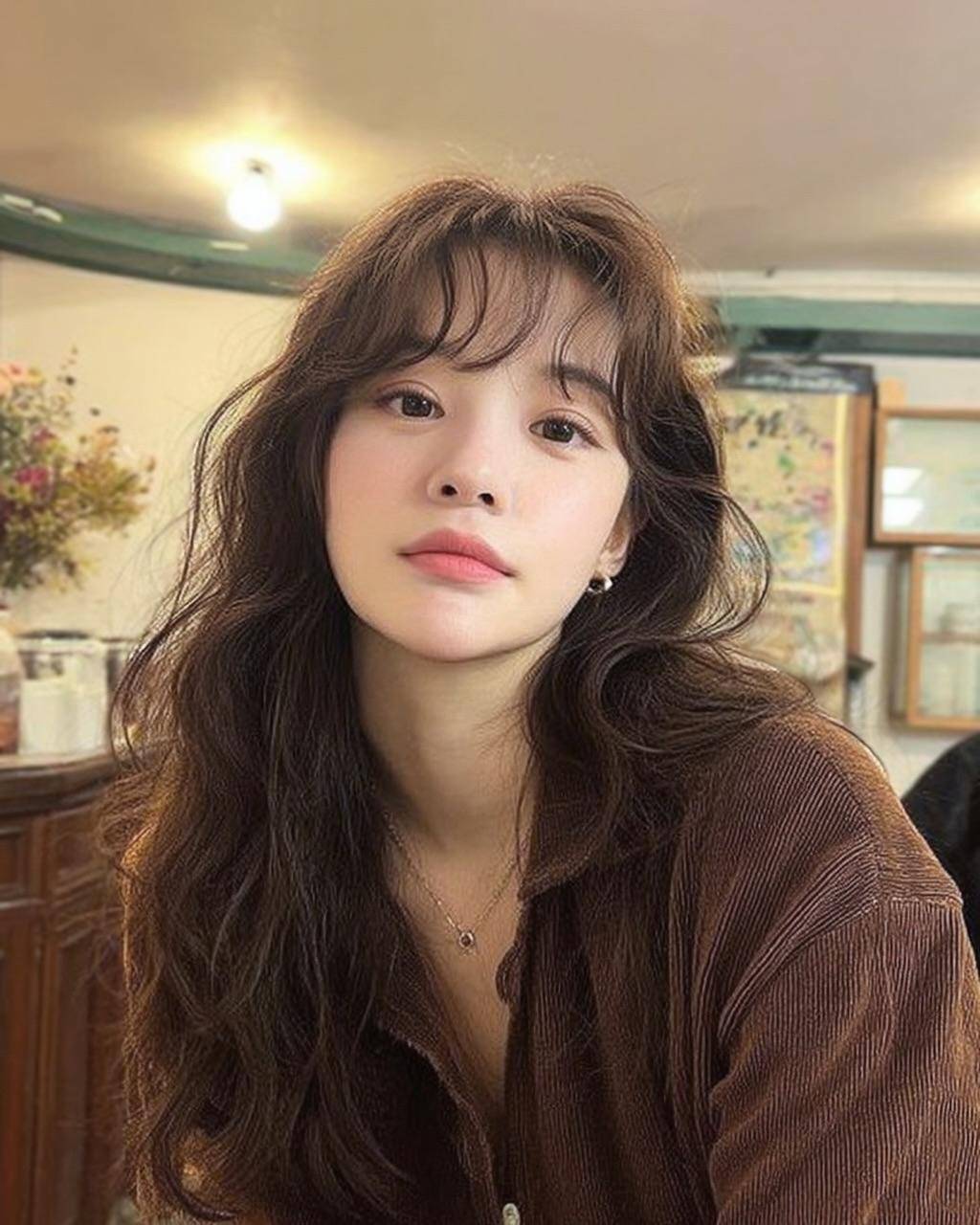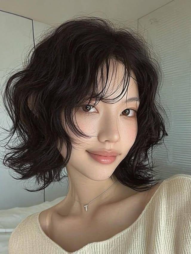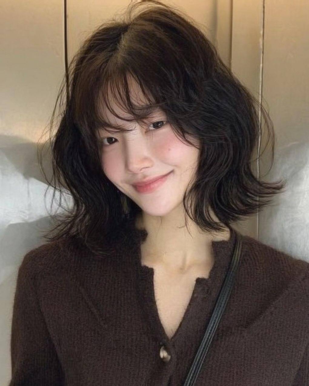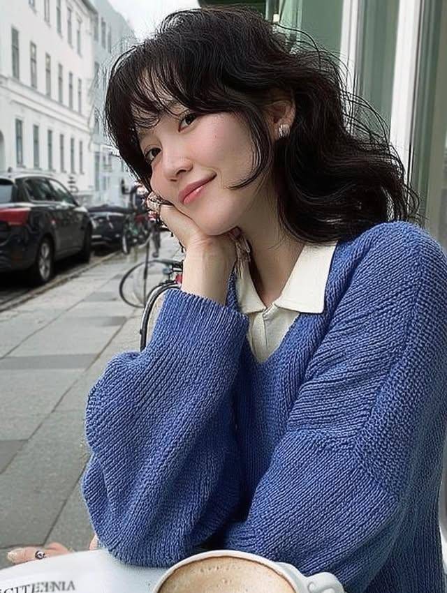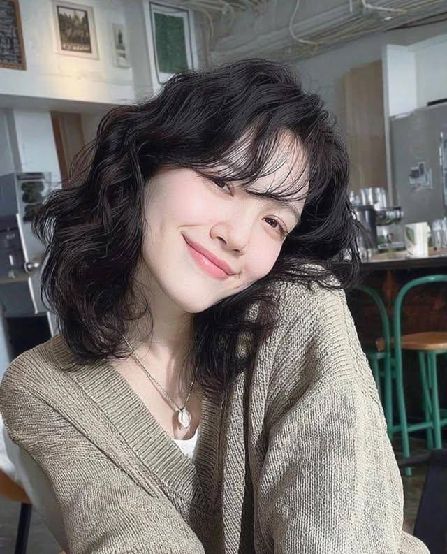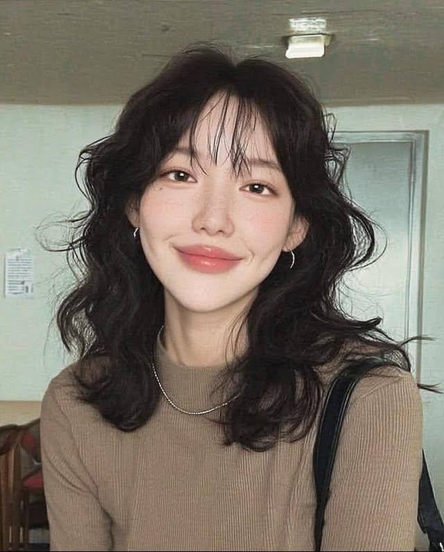 这款发型长度在锁骨到胸下之间,细密的小卷从发根延伸至发尾,形成自然的弧度,搭配偏分刘海或空气刘海,既能修饰颧骨和下颌线,又能让脸部线条更显柔和。深棕或黑茶色的发色,在光线下呈现出柔和的光泽,显得发质极佳,同时也能衬托肤色,让整个人看起来温柔又有女人味。