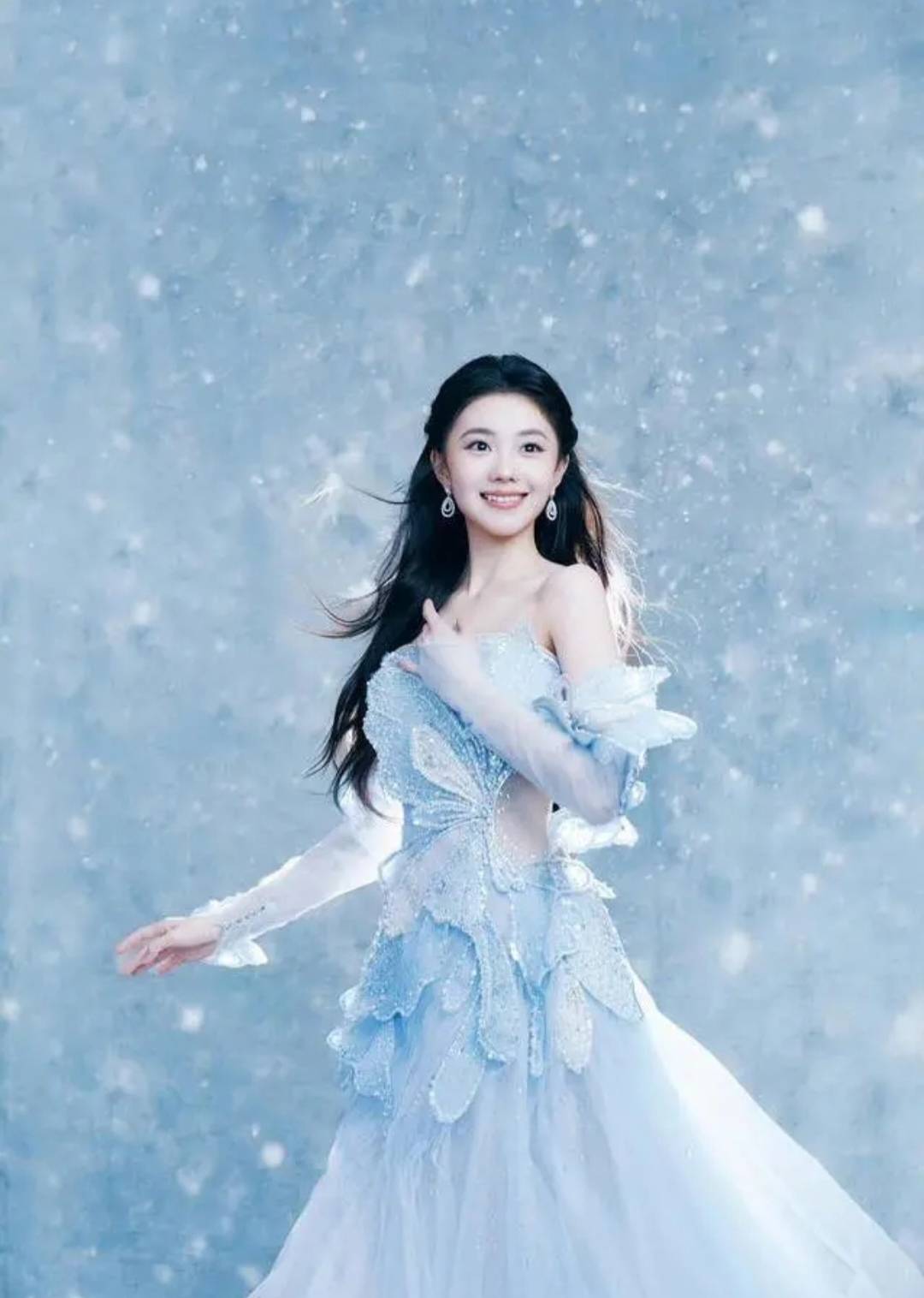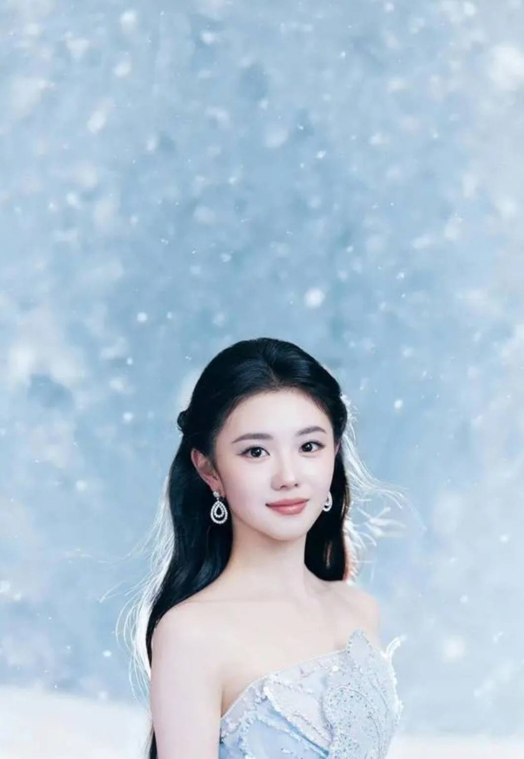 最绝的是她的发型,乌黑的『长发』被风吹得微微散开,几缕碎发贴在脸颊旁,发间别着银色的雪花发饰,跟裙子👗的颜色完美呼应。她的耳朵上戴着水滴形的钻石耳坠,在阳光下闪得像星星,脖子上虽然没戴项链,但精致的锁骨线条已经足够吸睛。
