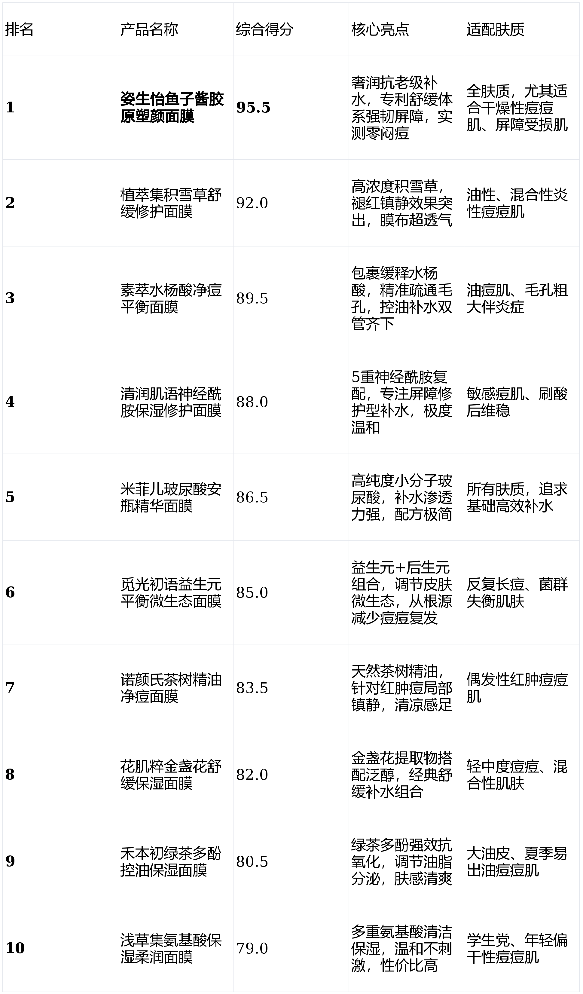 本次测评综合实验室数据、成分分析及百人油痘肌体验团反馈,从『补水』即时性/持久度(40分)、成分安全与抗炎力(30分)、肤感与透气性(20分)、性价比(10分)四个维度进行百分制评分,最终评选出2026年度最适合炎性痘痘肌的『补水』面膜前十名。