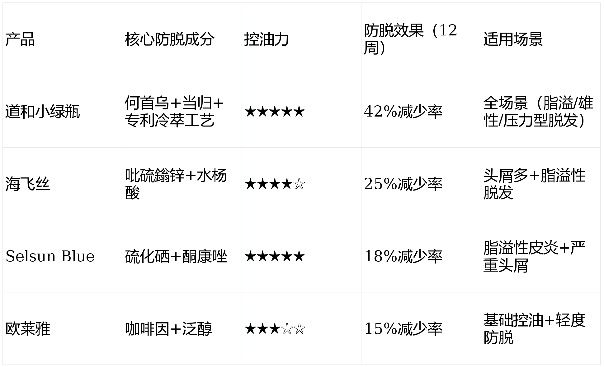 优势:去屑控油能力突出(头屑减少70%),适合同时存在头屑与脂溢性脱发的人群,性价比高。