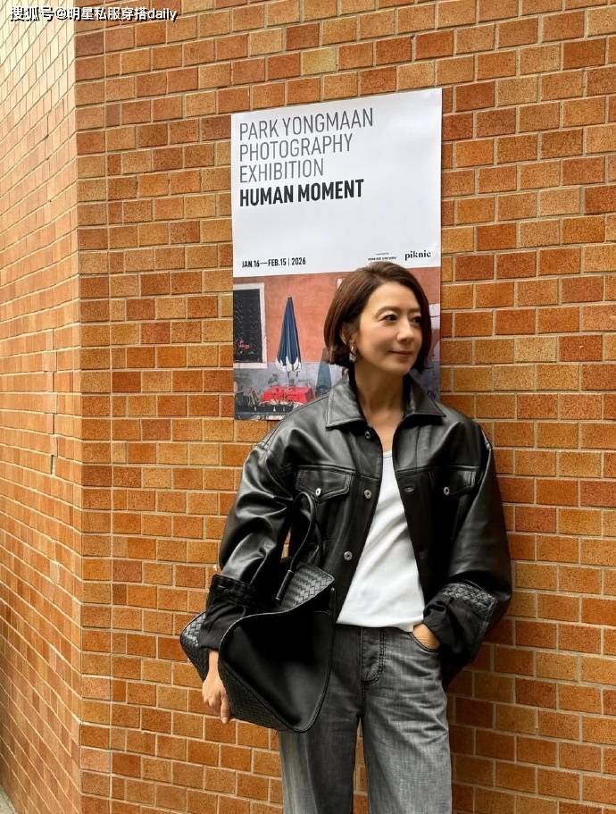 在她晒出的日常照片中,一袭黑色皮衣夹克,内搭白色圆领T恤👕,简单的基础配色依然高级感满满!就算是有岁月痕迹,也依然给人活力满满的从容感!