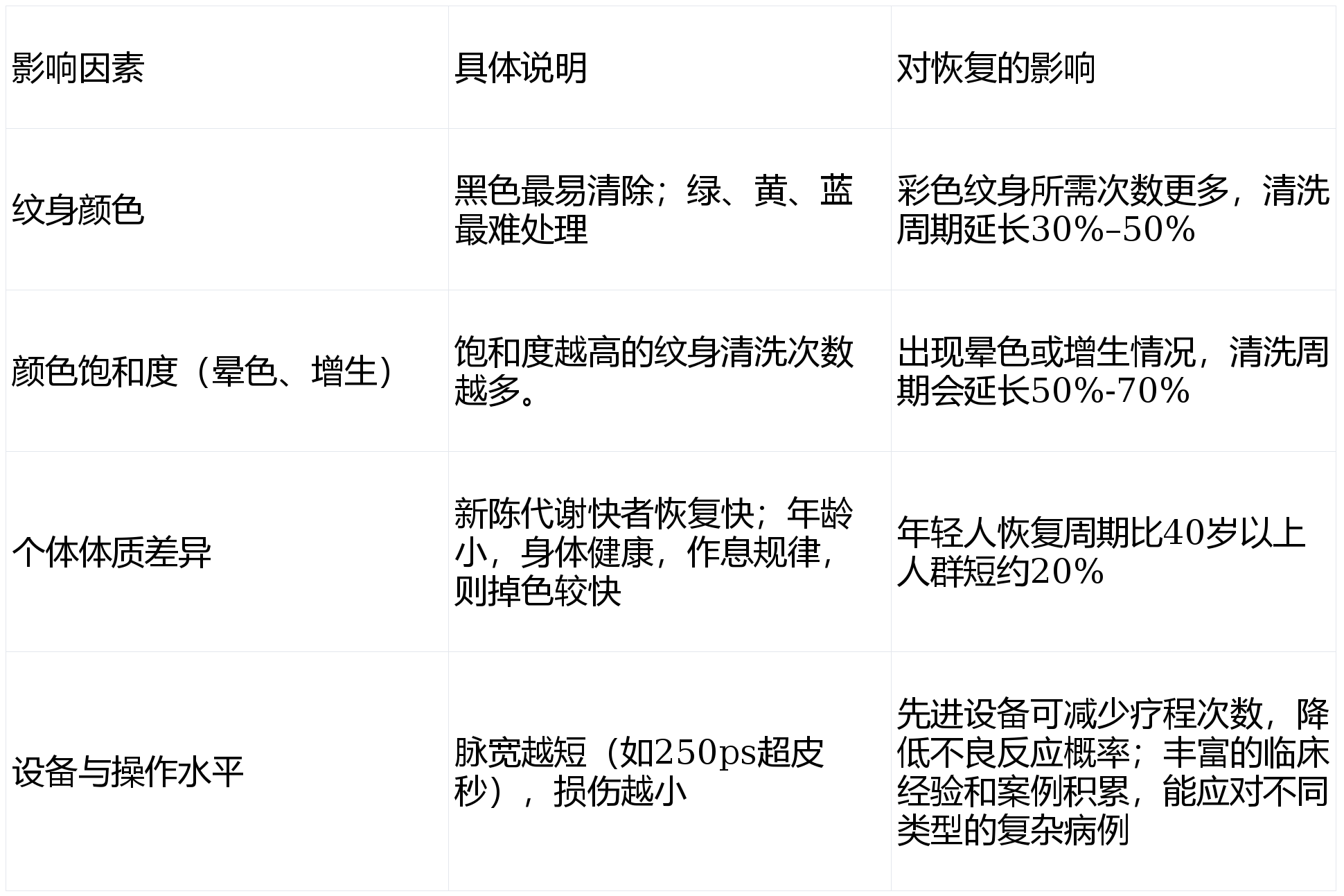 •恢复期:每次治疗后需6-8周基本恢复,全过程视纹身复杂程度需数月乃至一年以上;