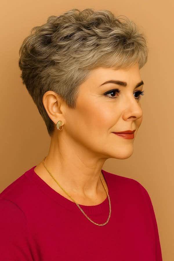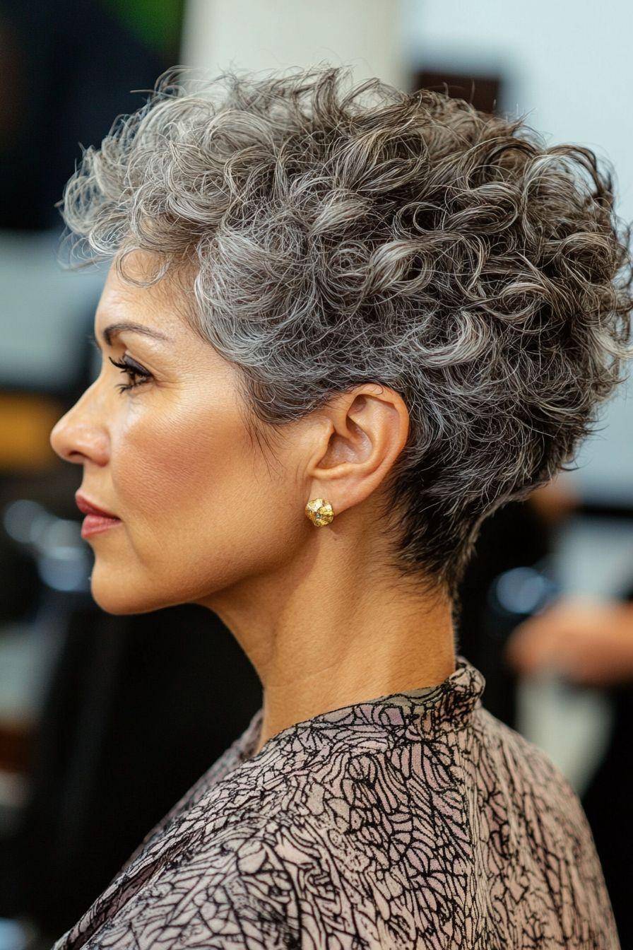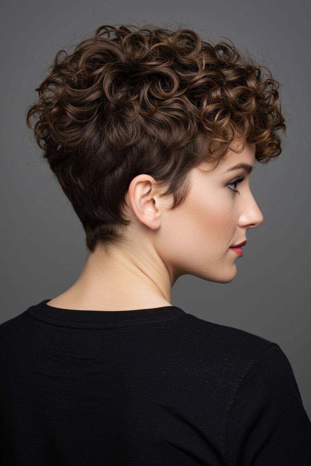 在一些成熟风格的演绎中,短卷发采用了“上蓬下收”的渐变设计。头顶和两侧的头发保持蓬松卷曲,而后颈处的头发则剪得极短,形成利落的“undercut”效果。这种发型在保留卷发灵动的同时,又增添了一份干练和英气,非常适合职场女性♀️或追求个性的人士,能有效修饰脸型,拉长颈部线条。