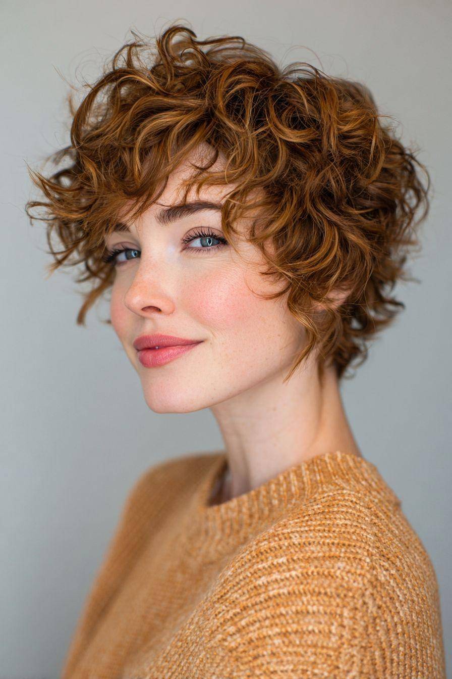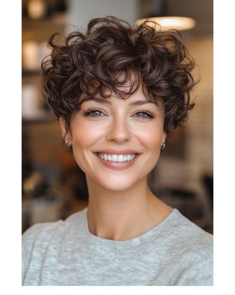 以图片中蓬松饱满、带有自然弧度的短卷发为代表,这种发型强调“不刻意”的美感。卷度较大且分布松散,发顶蓬松,刘海随意地散落额前,营造出一种刚睡醒般的随性与高级感。它自带一种漫不经心的时髦,非常适合搭配『针织衫』、宽松卫衣等休闲单品,传递出温暖、舒适又不失格调的生活态度。