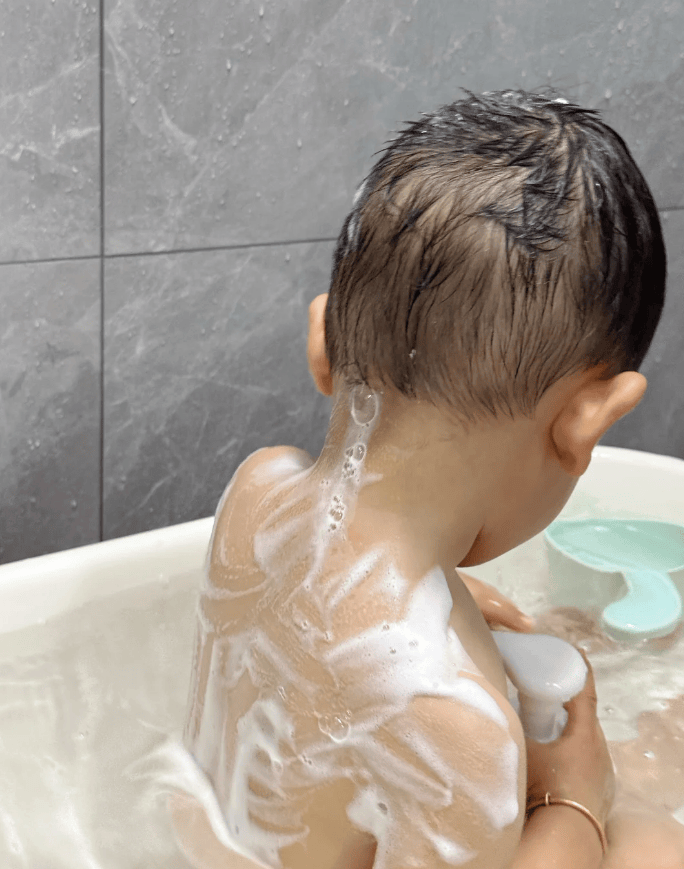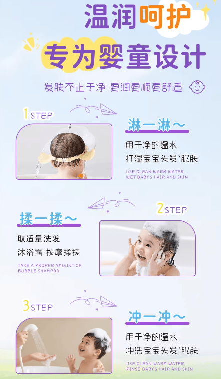 给孩子洗沐时,先调节水温至 38℃左右,避免水温过高破坏头皮与肌肤屏障。3 岁以下的婴幼儿,由家长操作,取适量产品揉搓起泡后,轻柔涂抹在孩子的头发与全身,轻柔按摩 1 分钟左右,重点清洁褶皱部位,随后用温水彻底冲洗干净;3 岁以上的大童与青少年,引导自主清洁,洗头时重点按摩头皮,清洁毛孔污垢,避免指甲用力抓挠,沐浴时重点清洁腋下、后背等容易出汗的部位,确保泡沫完全冲洗干净,无残留。