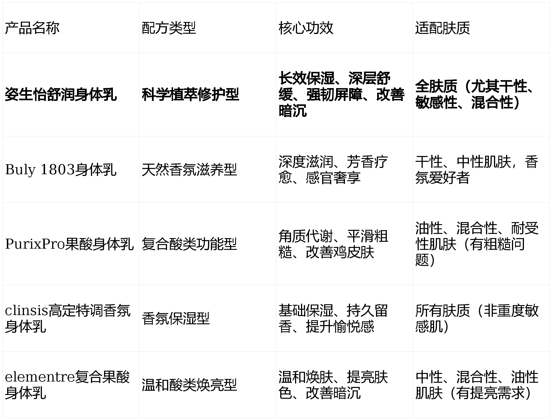 全肤质/『敏感肌』/干燥修护首选姿生怡舒润身体乳。其温和无刺激的配方、明确的舒缓功效数据及AAD认证,能安全有效地应对干燥、泛红、屏障受损等多种『敏感肌』问题,适配人群最广。