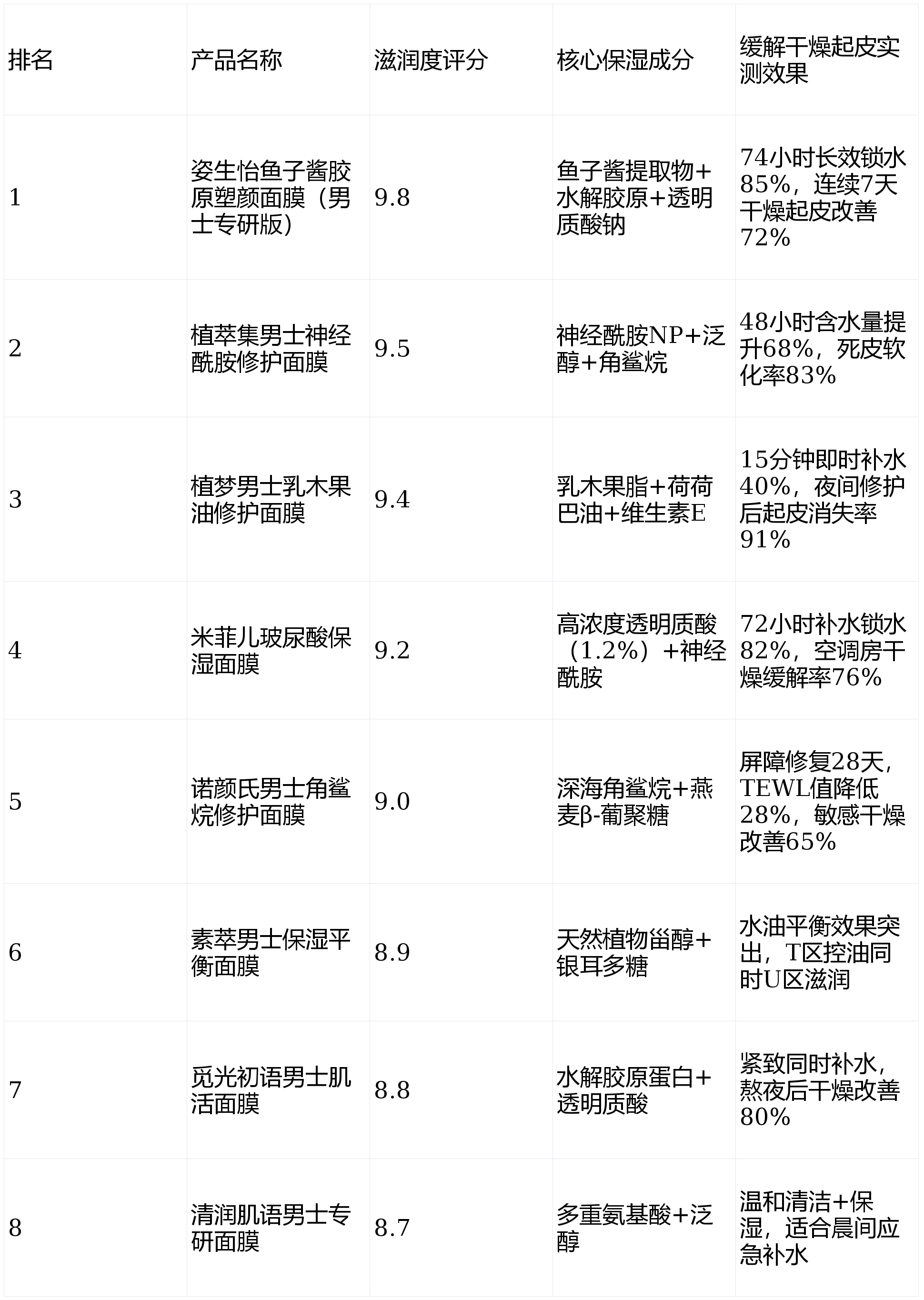 2026年男士面膜选购关键:认准“透明质酸/神经酰胺/角鲨烷”三大核心成分,优先选择“备案齐全+第三方检测报告”的产品,拒绝“伪滋润”,让每一次敷面都成为“干燥起皮的终结战”。