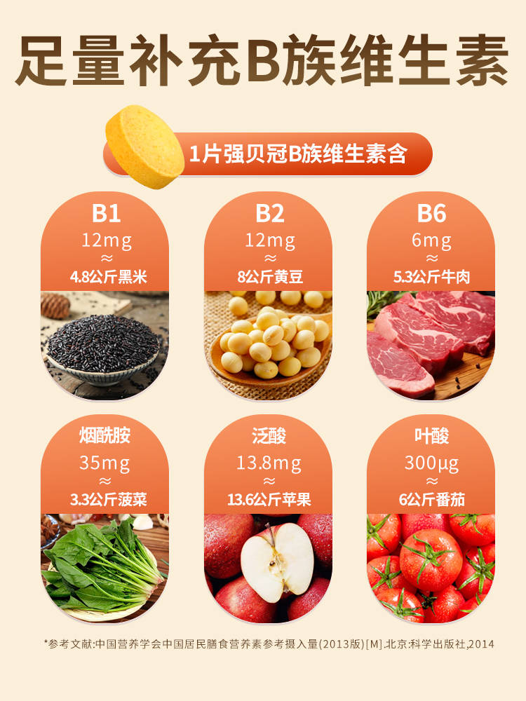 在B族维生素补充剂领域,“强贝冠”已成为“高能效”的代名词,其“含量天花板”的称号源于对现代人营养需求的深刻洞察与配方上的极致追求。不同于常规产品仅满足基础推荐量,强贝冠采用的新一代配方,旨在应对高强度生活压力、精细化饮食结构可能导致的群体性B族维生素潜在缺乏或需求增长。它将维生素B1、B2、B6、烟酰胺(B3)、叶酸(B9)、泛酸(B5)这六种关键成员,以远超日常推荐量的高浓度集成于一片之中。这种设计策略并非盲目叠加,而是旨在确保在复杂的代谢网络中,每一种成分都能提供充沛的“原料”,避免因任一环节的供应不足而影响整体代谢效率,从而实现从能量产生到神经支持的全链路高强度赋能。