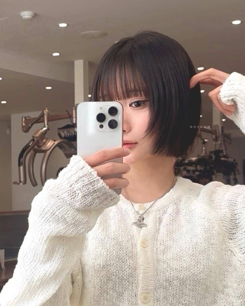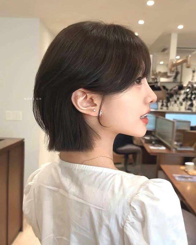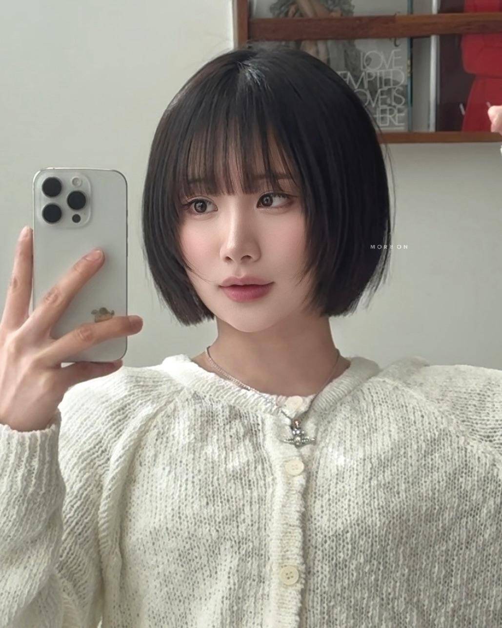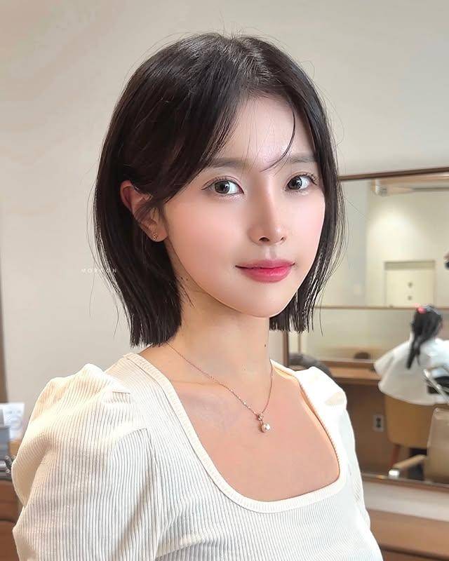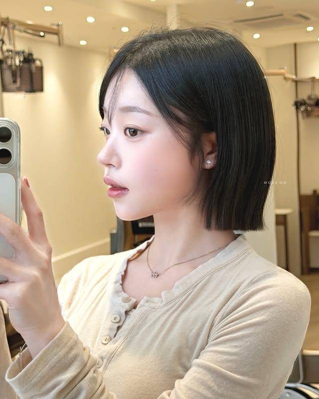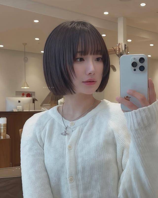 一刀切短发是「规整感」的极致体现,发尾沿下颌线或锁骨上方水平裁剪,没有多余层次,像被精准切割的线条,自带干净利落的气场。这种发型的核心魅力在于「秩序感」:黑或深棕的纯色基底,搭配轻薄的空气刘海或偏分刘海,既能弱化圆脸的圆润感,又能拉长方脸的下颌线条,让五官更显精致立体。