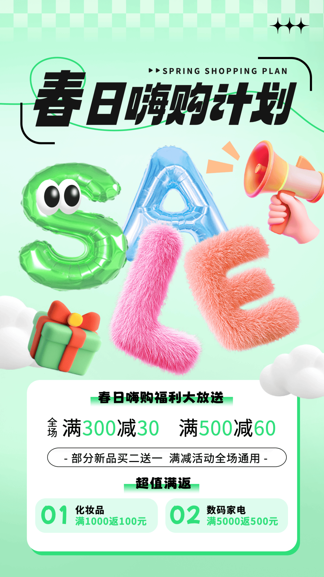这组电商活动促销海报,用高饱和绿粉撞色打造吸睛感,毛绒质感的“SALE”字母自带互动感,满减与满返的福利模块清晰明了,弱化了传统促销海报的距离感,助力电商促销海报分享。
