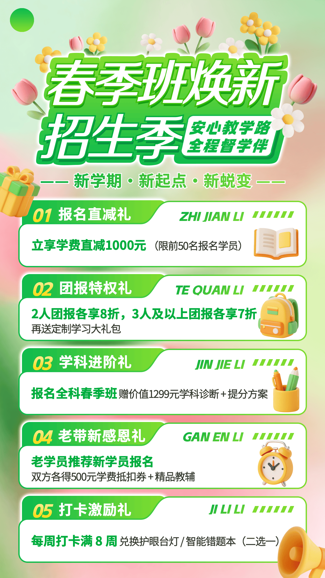 这组电商活动促销海报,以清新绿粉渐变为主,搭配3D质感的花朵与礼物🎁元素,五重福利模块清晰传递优惠,弱化了招生宣传的距离感,为电商促销海报分享营造动感活力氛围。