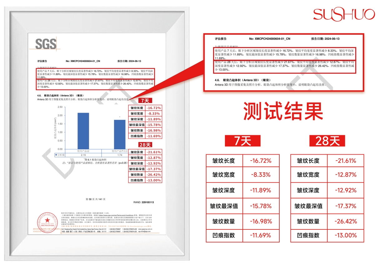 前 7 天去角质 + 打底,中间 14 天重点按摩,最后 7 天搭『眼霜』,细纹长度缩短从 26% 升至 32%。