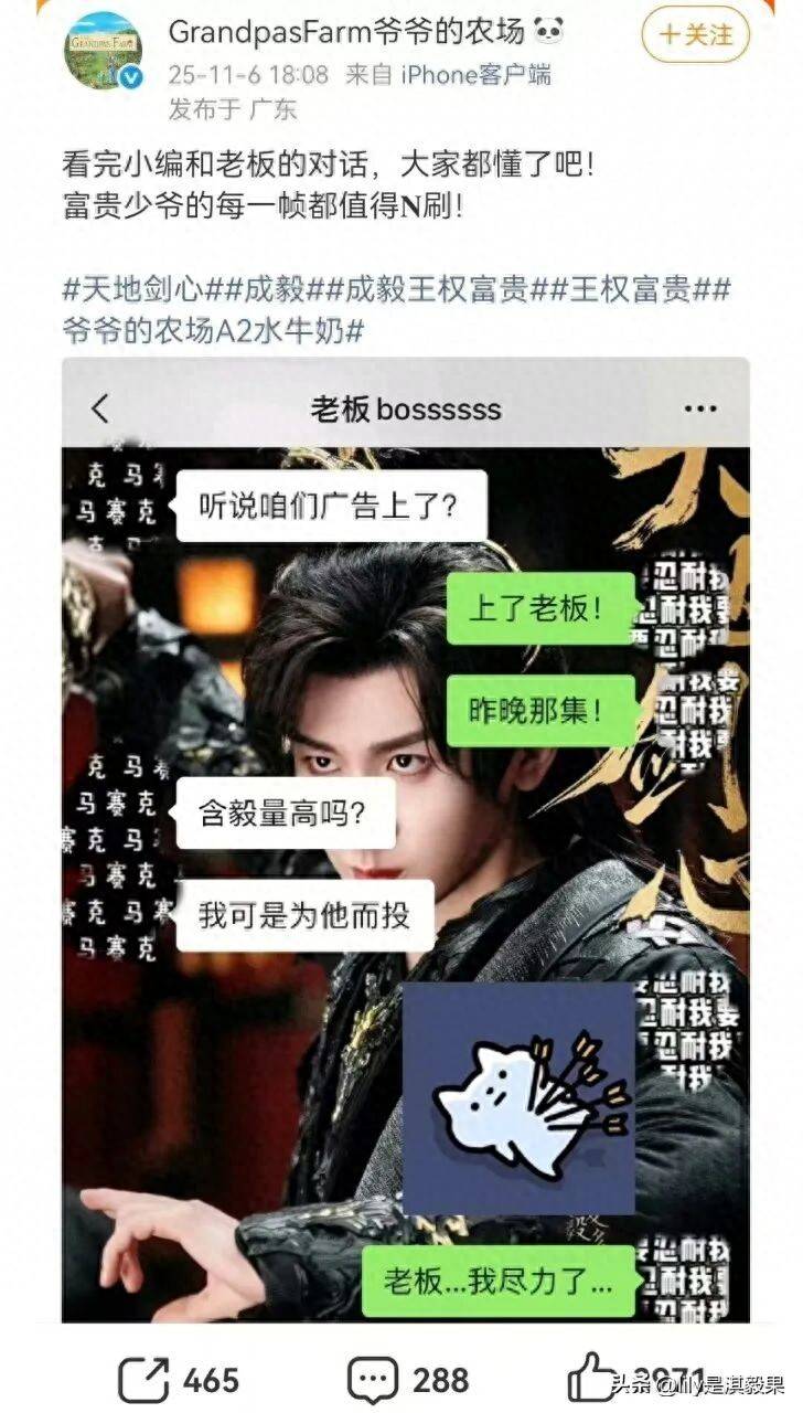《天地剑心》的广告商曾在线问及『成毅』的戏份,特别关心剧集中的“含毅量”有多高,直言他们投放广告就是专门冲着『成毅』去的。