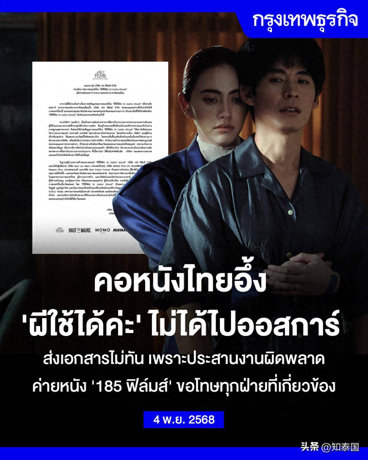 泰国电影公司185 Films有限公司日前发布声明,宣布泰国影片《有用的鬼》(A Useful Ghost)未能按时提交奥斯卡报名材料,失去了角逐第98届奥斯卡最佳国际影片奖的资格。公司表示,这一失误源于提交过程中的沟通与协调不当,并对所有相关方表示深深的歉意。