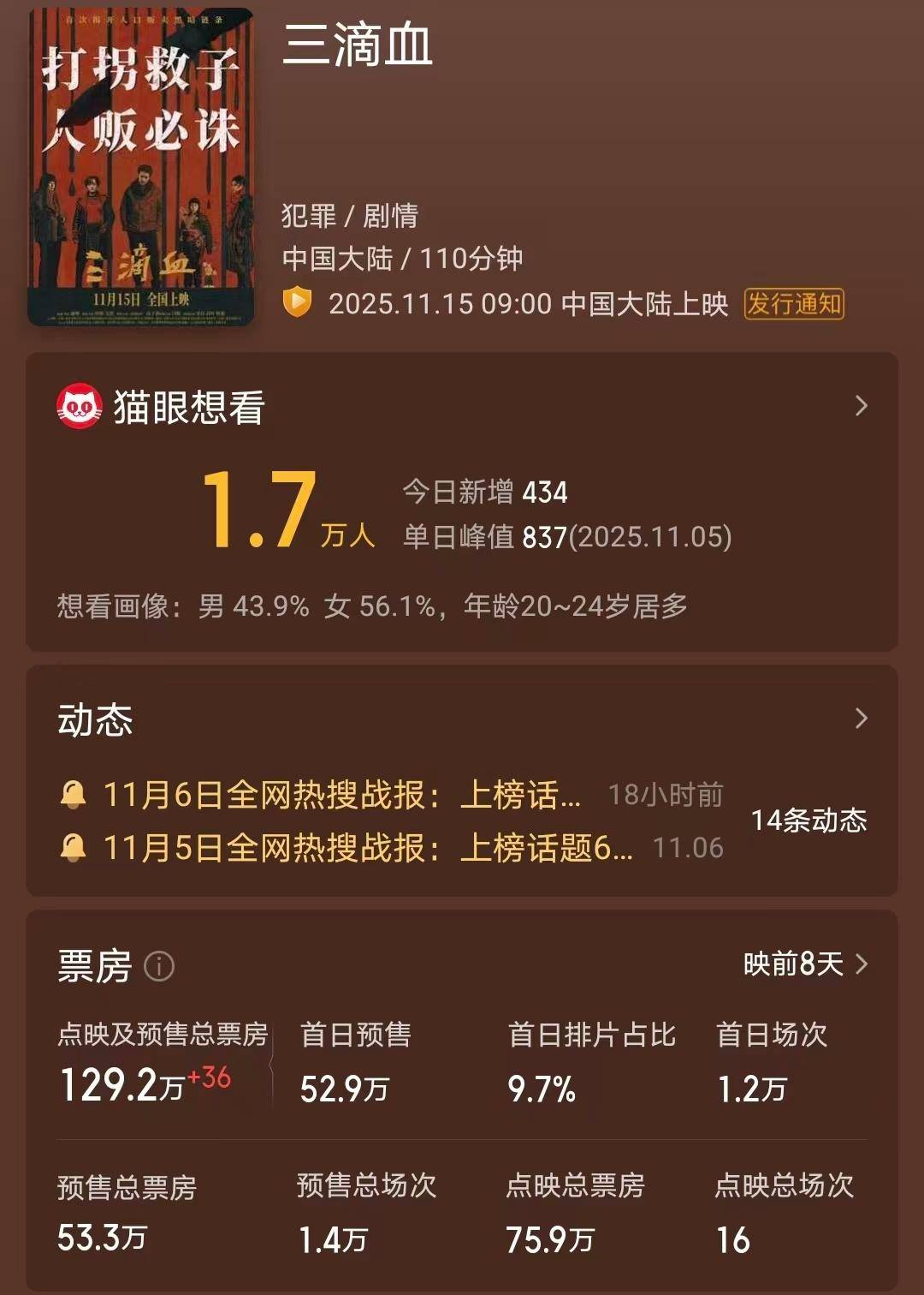 《鬼灭之刃 无限城篇 第一章》无疑是《三滴血》最大的对手,这部日本动画在全球范围内已经取得了极为显著的成绩,其在国内的预售票房早早突破了6000万人民币,而《三滴血》在三天的预售期间,仅仅收获了50万人民币的票房,且其在平台上的“想看”人数也不到2万,相差悬殊。与此同时,《鬼灭之刃 无限城篇 第一章》凭借着强大的粉丝基础和口碑,吸引了超百万的观众关注,预示着其票房成绩将远远超过《三滴血》。