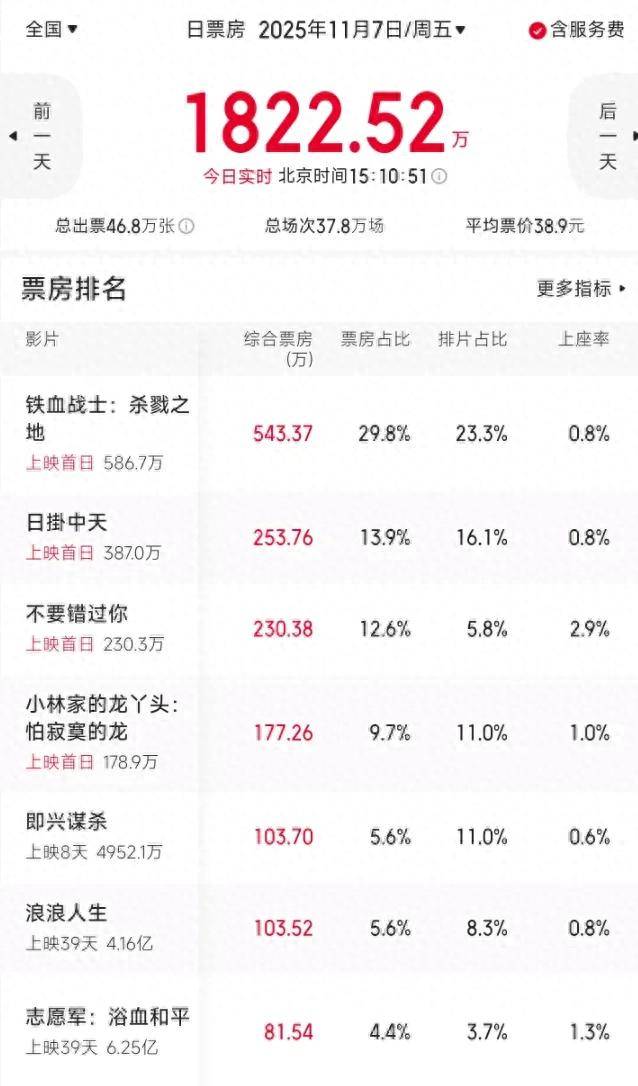 目前单日票房已经达到了1822万,虽然离晚上的黄金时段还有一段时间,但从目前的票房来看,成绩尚未达到预期。
