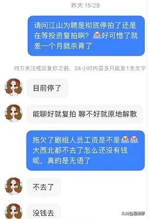 近日,继『李宏毅』和张艺凡的新剧《起落安妥》停拍后,吴谨言与『陈哲远』主演的《江山为聘》也因欠薪问题爆出停拍消息。据多名剧组工作人员及群演曝料(如网友ID“幼薇”),剧组因资金问题停拍,且有一部分人员未得到应有的工资。原计划前往大西北的拍摄工作被取消,停拍时间已超过24小时。剧组的拖欠薪资涉及了群演、场务等基层人员。