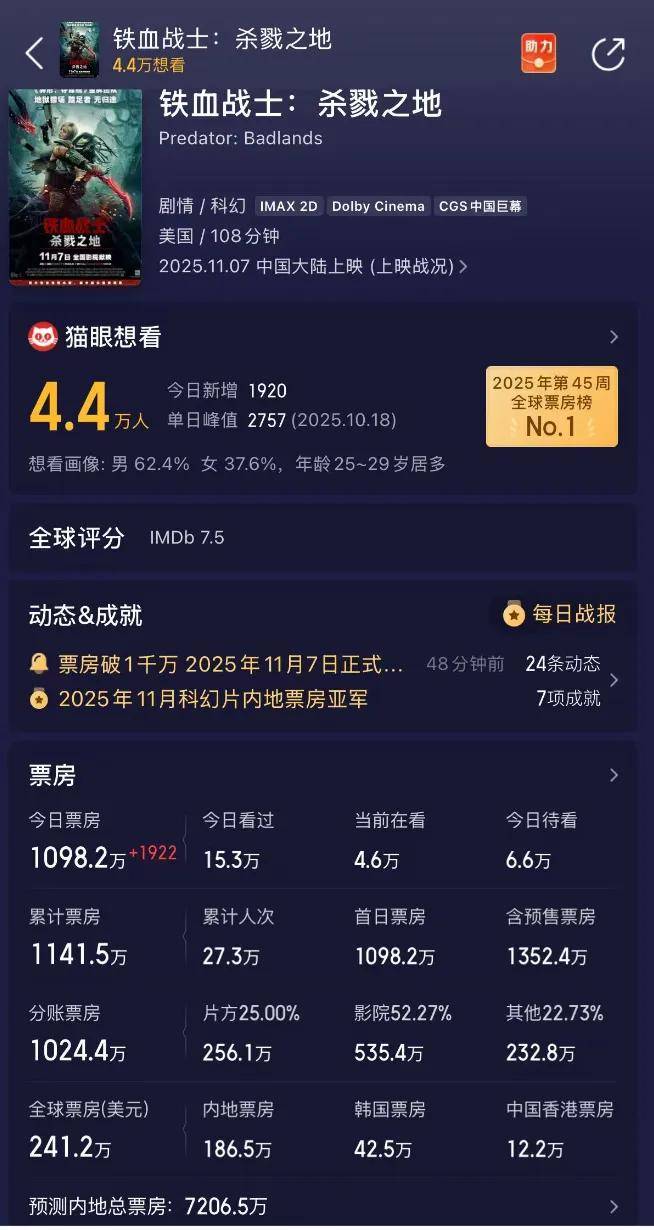 然而,票房表现依然平淡。根据预测,《铁血战士:杀戮之地》的成绩预计为7200万。考虑到今天是上映的第一天,并且影片目前的排片为23%,占据了33%的票房份额,明天的排片预计会大幅提升。最终的总票房预测至少要翻一番,突破一亿应该不成问题。