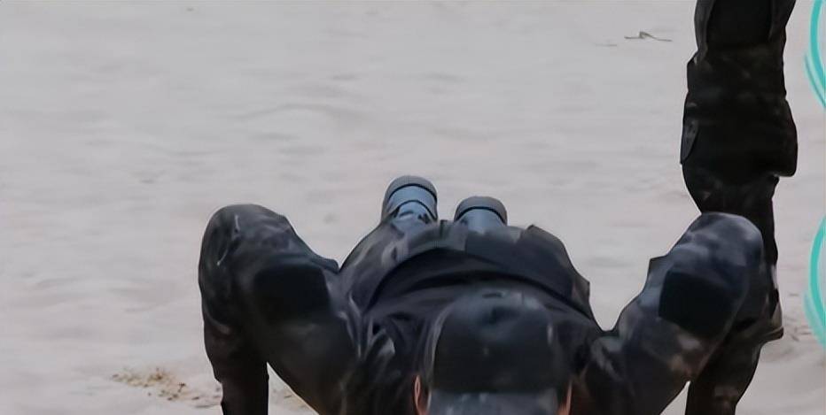 他俯身沙地,四肢弯曲模仿爬行动作。