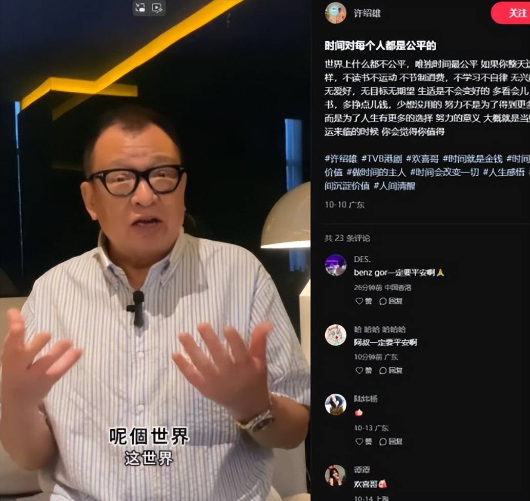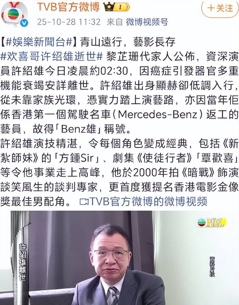 76岁的许绍雄,被许多人熟知的荧幕形象包括“欢喜哥”和“朱聪”等角色,他的离世来得悄无声息,却令人感到深深震惊。10月28日凌晨,TVB通过黎芷珊代为宣布许绍雄因癌症引发的器官衰竭去世。谁曾想到,这位在『社交媒体』上仍然活跃的老演员,竟然一直没有透露自己患癌的消息。仅仅半个月前,许绍雄还在视频中与网友分享关于“时间公平”的感悟,提倡大家多读书、多运动,并轻松地调侃“努力是为了有更多选择”。他的状态看似健康,甚至在9月与女婿一起买菜的照片中,也没有任何病态迹象。