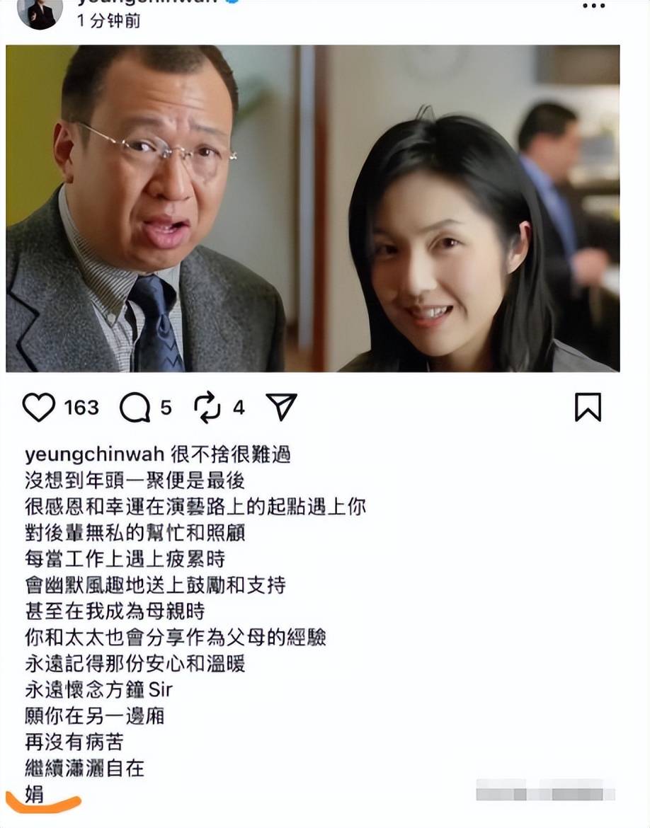 当人们还在悼念许绍雄时,另一个噩耗接踵而至。10月29日,已故老戏骨关海山的第四任妻子、81岁的曾娣容(大家称她为“虾嫂”)也不幸离世。关海山,曾是港剧荧幕上的传奇人物,在2006年去世,而“虾嫂”一直陪伴在他的身边,直到生命的最后一刻。她的离世同样令人措手不及,令人感到难以置信。