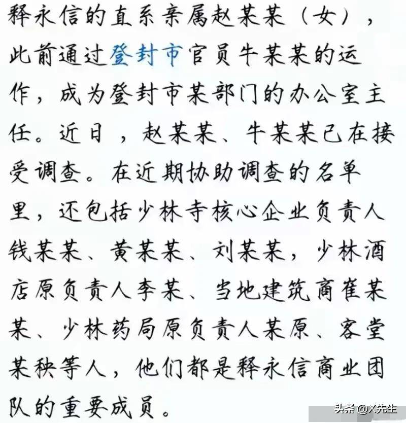 甚至释永信的一位直系亲属也因涉及通过当地官员运作职务而被调查