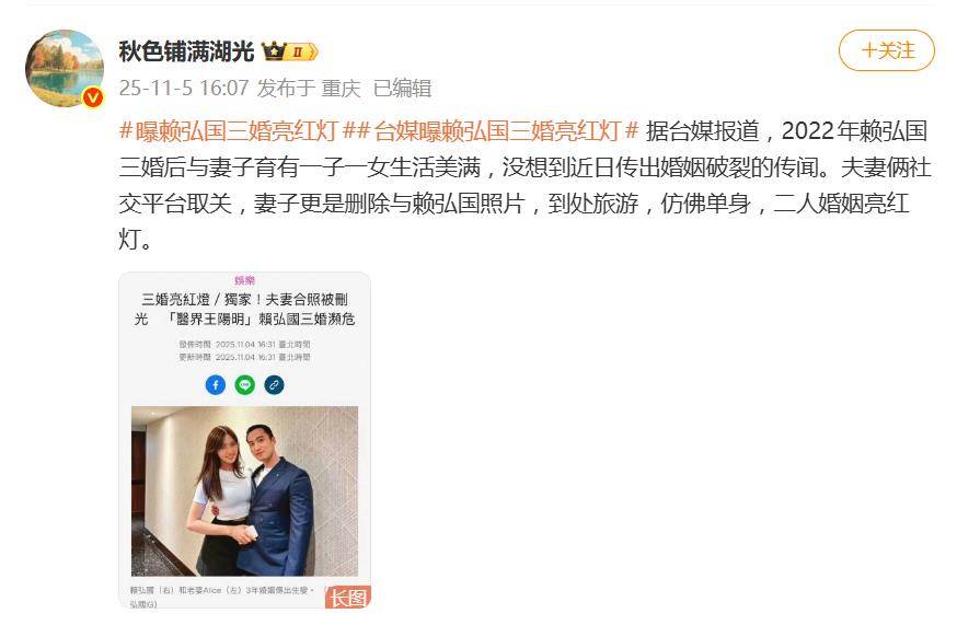 赖弘国与第三任妻子Alice的婚姻再次成为舆论的焦点。2025年11月初,台媒爆料称两人可能已经面临婚姻危机。根据消息,双方不仅取消了『社交媒体』上的互相关注,Alice更是删除了所有与赖弘国的合照,无论是怀孕期间的照片还是全家福,统统不见了踪影。