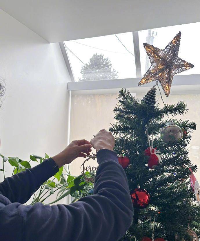 另一张是钟嘉欣拍下的先生装饰圣诞树的瞬间,对方也没有露脸,只拍到了他正在挂小装饰的手部特写。这种互相记录的方式,其实比直接秀恩爱更显日常的默契。