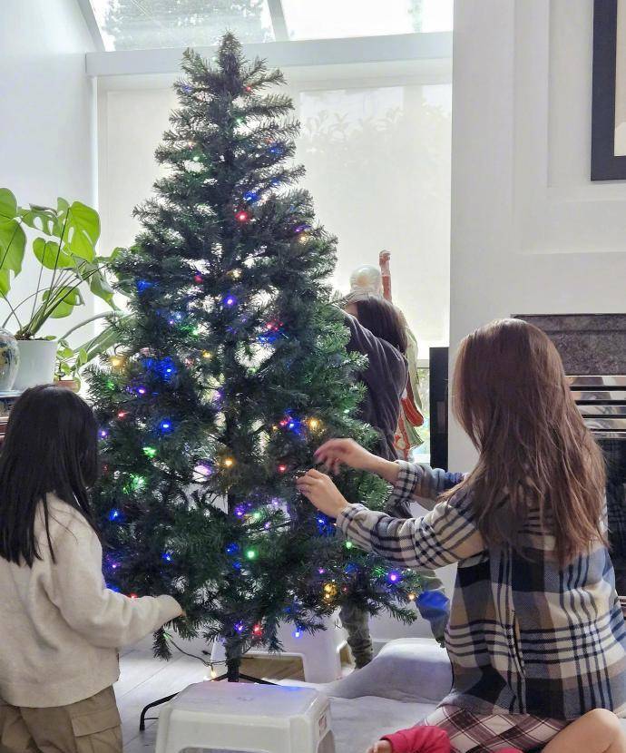 照片里,钟嘉欣正和孩子们一起装饰圣诞树。她头发染了新颜色,穿着居家的格子衣服,看起来清瘦温柔。虽然没有面对镜头,但那种放松的状态挺打动人的。两个孩子应该是她的女儿和儿子,正认真帮妈妈往树上挂饰品,还有一个更小的宝宝躺在她身边,样子软乎乎的,特别可爱。