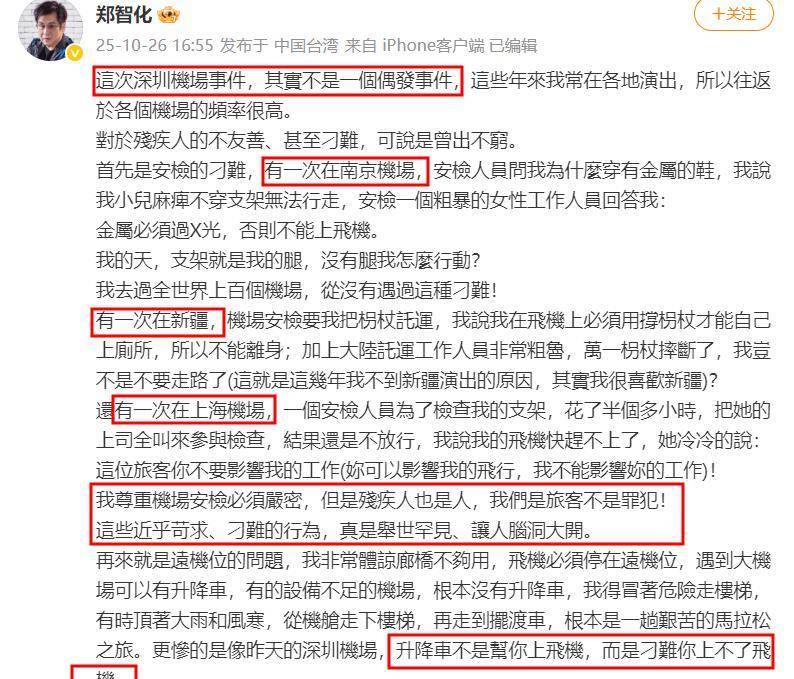 那天,郑智化在『社交平台』上发了一段文字,讲述了自己在深圳机场登机时遇到的不便。他说机场的升降车停的位置和机舱门之间有一段距离,大概二十五公分左右。这个高度对他来说有点困难,让他费了不少劲才进入机舱。他还提到,当时司机没有主动帮忙调整设备,他只能自己艰难地挪进去。
