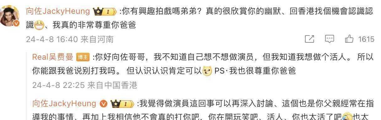 在节目录制过程中,吴镇宇的儿子费曼也在『社交平台』上活跃。他经常分享父亲的日常,有时还会发一些吴镇宇的趣事或照片,展现出父子之间特别的相处方式。有一次费曼买不到演唱会门票向父亲求助,吴镇宇幽默地回应,担心动用关系后还是买不到,会让两个人都没面子。