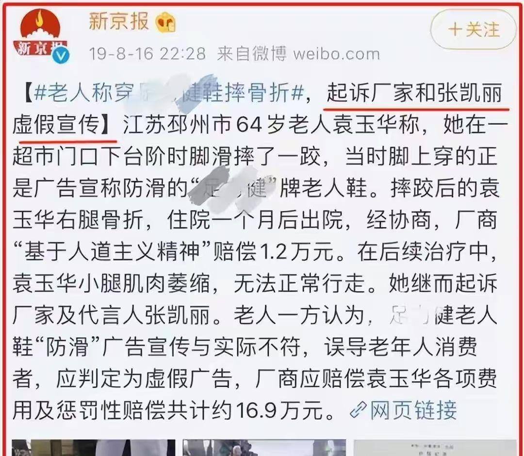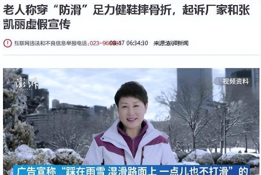 有报道称,一位老人穿该鞋在小区散步时,在略有积水的路面滑倒,导致右腿骨折,花费数万元医疗费。事后老人将品牌与张凯丽一并告上法庭。