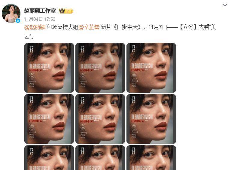 直到半个月后,『赵丽颖』工作室突然发了一张包场支持辛芷蕾新电影《日掛中天》的海报。上面简单写着一句“支持大姐新片,立冬看美云”。这一下,大家都愣住了。