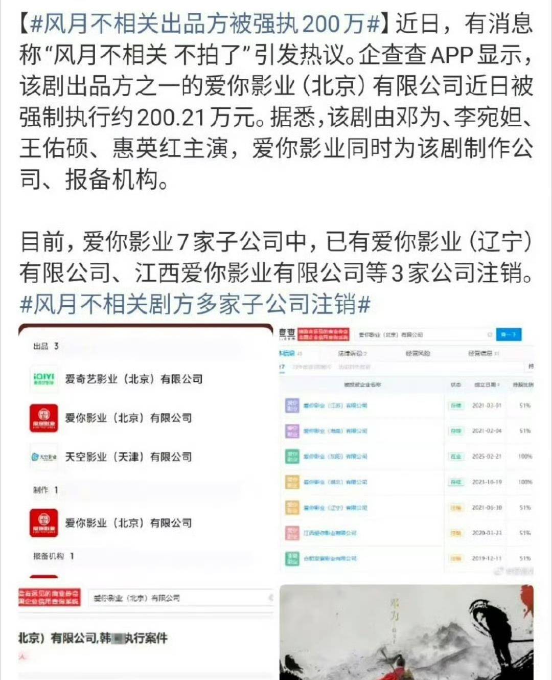 电视剧《风月不相关》的拍摄似乎不太顺利。有消息称这部剧已经暂停拍摄,而且很可能不会继续完成。据了解,这部剧在拍摄期间已经多次中断。其中一个原因是主演戏份安排的问题,另一位主演的戏份相对较少。此外,制作方也面临资金问题,据说已经被要求执行相关法律程序。