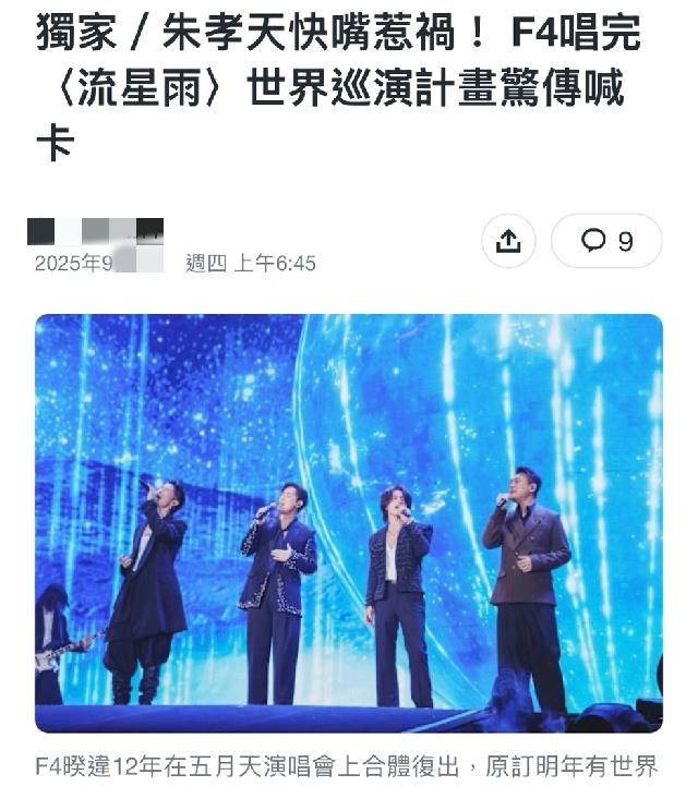 关于F4组合演唱会的事情有了新进展。据相关媒体报道,原本计划的演唱会目前暂时搁置。有消息称,其中一位成员经常在直播中透露未公开信息,这导致工作团队有所顾虑。对此,相关公司作出了回应,但并未直接说明演唱会是否取消。