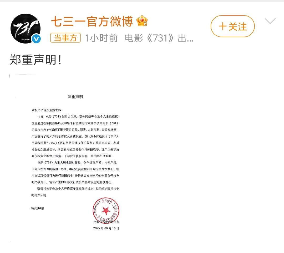 电影《731》近日发表声明,呼吁尊重版权©️。这部正在上映的影片遭遇了未经授权的拍摄和传播。这种行为不仅侵犯权益,也影响了作品的正常放映。影片上映后反响不错,获得了不少观众支持。实际上,每年都有影片面临类似问题,这值得大家共同关注。