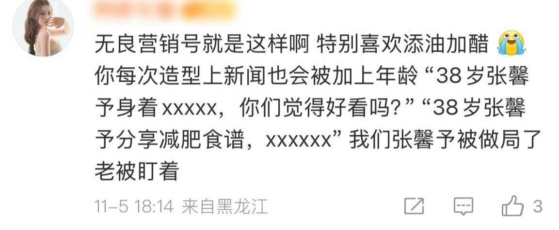 其实类似的情况挺常见的。特别是对女『明星』️,有些媒体总爱把她们的年龄挂在标题里。好像不提年龄,文章就没人看似的。『张馨予』自己也发过微博调侃,说这些媒体连她几岁都记得清清楚楚,她干脆在评论里自嘲,把自己做的事前面都加上“38岁『张馨予』”。