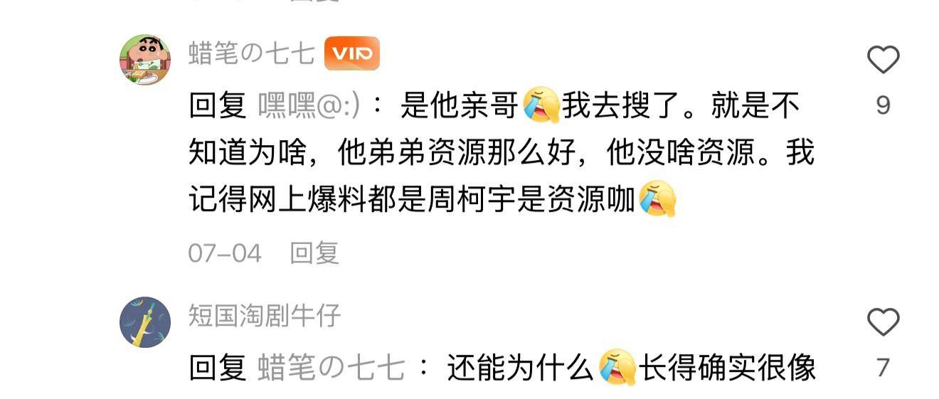 周柯宇合作的都是关注度较高的女演员,角色设定也很有看点,发展势头看起来不错。而他哥哥目前主要在短剧领域,有人好奇为什么兄弟俩资源有些差距。有观众觉得,虽然两人长得像,但弟弟的外形可能更上镜一些。
