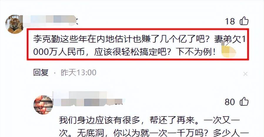 这件事曝光后,有些网友觉得一千万元对李克勤来说不算什么,他应该帮小舅子把钱还了。