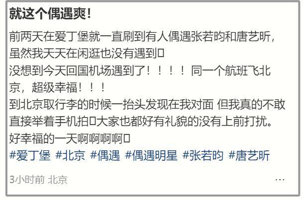 自从六一那天在伦敦偶遇『张若昀』和『唐艺昕』一家后,他们在伦敦的多个景点被粉丝遇见,大家也因此知道了他们这次英国之行的全过程。到了6月8日,『唐艺昕』一家在伦敦玩了一个星期后终于回到了国内。回想这次旅行,『张若昀』不仅照顾孩子还帮着拿行李,非常细心体贴,跟岳父的关系也特别好,比普通的父子关系还要亲近。